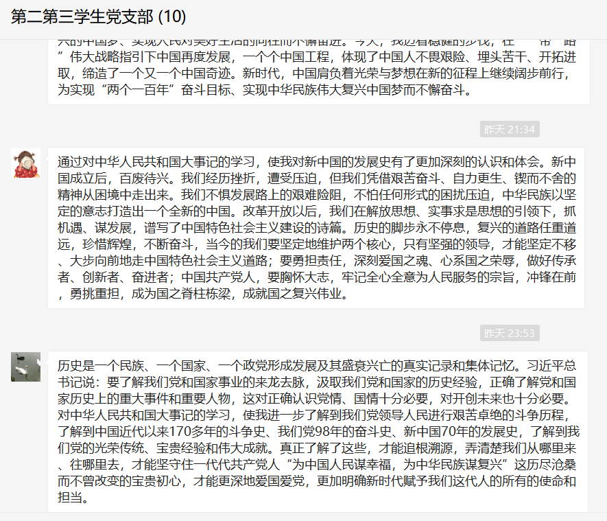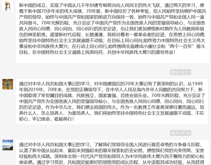 第二、第三员工党支部全体党员教师通过支部集中学习和个人自学《中华人民共和国大事记》,感受颇深,纷纷在微信群内发表学后感想和体会。通过此次学习,全体党员教师对党的历史有了更加深刻的认识,在今后的工作中,要继续发扬党的优良传统,勇挑重担,为教育事业贡献自己的力量。