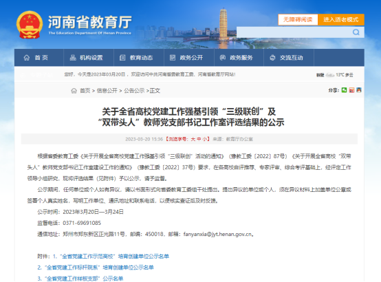 2023年3月20日, 河南省教育厅对全省高公司党建工作强基引领“三级联创”及“双带头人”教师党支部书记工作室评选结果进行公示。公司党总支被评为“全省党建工作标杆院系”培育创建单位、3044永利集团教师党支部被评为“全省党建工作样板支部”。这是在公司员工第一党支部获得全省首批样板党支部后,党建工作上的又一成绩突破。公司党总支将以此创建活动为契机,持续推进“三带三促三协同”党建创新模式,落实落细“一支部一特色一品牌”建设,在总支、支部、党员三个层面持续发力,真正做到以高质量党建带动3044永利集团事业高质量发展,以高质量党建培根铸魂、提升党建育人实效。