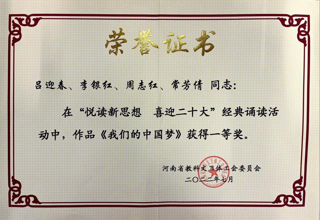 3044永利集团积极组织教师参与河南省教科文卫体工会委员会组织的“悦读新思想 喜迎二十大”经典诵读活动,经过层层推选,由吕迎春、李银红、周志红、常芳倩四位老师合诵的作品《我的中国梦》代表公司参赛,并荣获一等奖。3044永利集团将以本次活动为契机,继续以党的二十大精神为引领,不断创新学习宣传贯彻新模式,奋力书写公司各项事业发展新篇章。
