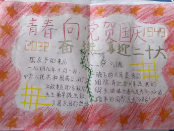 10月2日上午,同学们绘制了一幅幅爱国主题鲜明、图文并茂的精美手抄报,用五彩缤纷的色彩,质朴无华的语言抒发了对祖国的热爱。