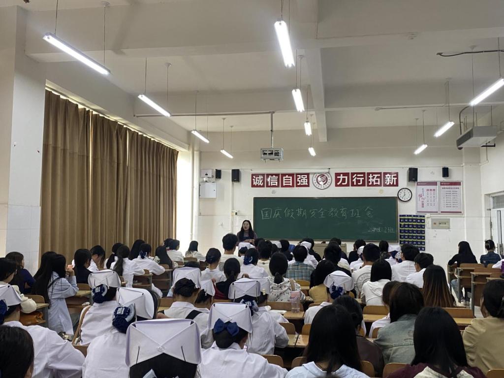 主题班会中,辅导员一是全面开展安全教育。安全是首位,辅导员重点从旅行安全、交通安全、假期兼职安全、防溺水安全、食品安全、警惕电信网络诈骗、应对极端天气安全、关注心理健康、消防安全等方面对员工进行安全提醒,教育引导员工树立遵纪守法、心存敬畏的法治观念。二是强调离留校员工管理要求。要求员工如实填写假期行踪记录表,建立离留校员工管理台账。离校员工严格落实“双报备”出行和“双报平安”联系制度,关注生命财产安全,按时返校。留校员工严格遵守校规校纪,服从宿舍作息安排,遵从宿舍管理规定,同学之间和谐相处等。三是宣读国庆假期安全告知书。再次强化同学们安全意识,提醒同学们在享受假期快乐时光的同时,注意好个人安全和公共安全。