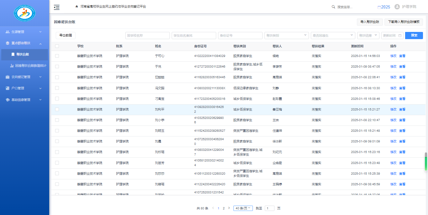 六是精准帮扶助就业,力求实现“一生一策”。持续开展重点群体帮扶,对困难员工进行了全面摸底调查,建立了详细的困难员工就业帮扶台账,校院领导、辅导员上门走访部分困难员工,线上开展困难生家访慰问,了解员工就业需求与家庭实际情况,给予就业规划指导,主动提供就业岗位。