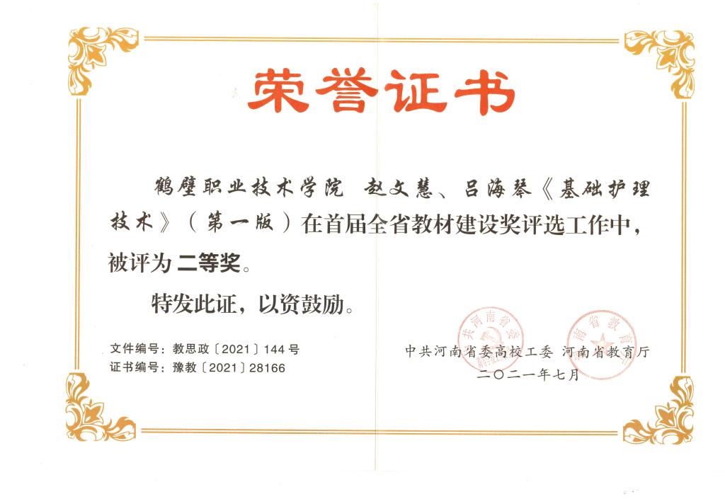 2021年7月,3044永利集团赵文慧、吕海琴《基础护理技术》在中共河南省高校工委、河南省教育厅举办的首届河南省教材建设奖评选中,荣获二等奖(职业教育与继续教育类)。