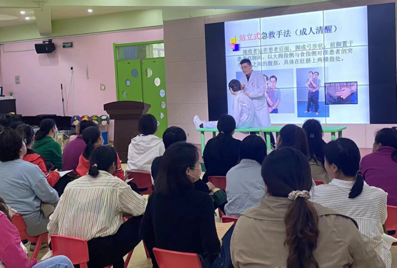 培训过程中,宋涛老师分别从理论讲授、演示教学、实践操作等环节,详细生动地讲解了“海姆立克急救法”和“心肺复苏技术”等基本救护方法和注意事项。向现场的老师们解说幼儿异物卡喉时如何采用正确的方法进行抢救;突发呼吸心跳停止时如何在有效的抢救时间内,对呼吸心跳骤停的患者进行应急救护;对两种急救方法进行了标准的的操作示范。培训现场气氛十分活跃,参训老师积极参与操作,培训老师认真的对参训老师的现场实操进行指导,本次培训得到了全体参训老师的认可,取得了非常好的培训效果。