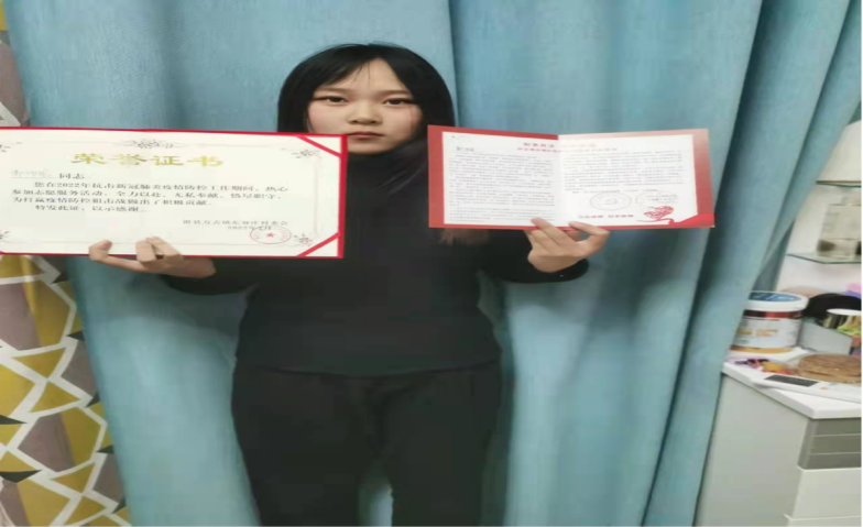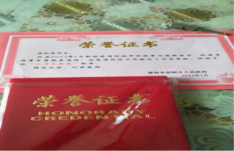2022年1月10日——1月25日,在原阳县阳阿乡疫情防控中参与值班执勤,被授予“优秀志愿者”称号。