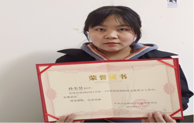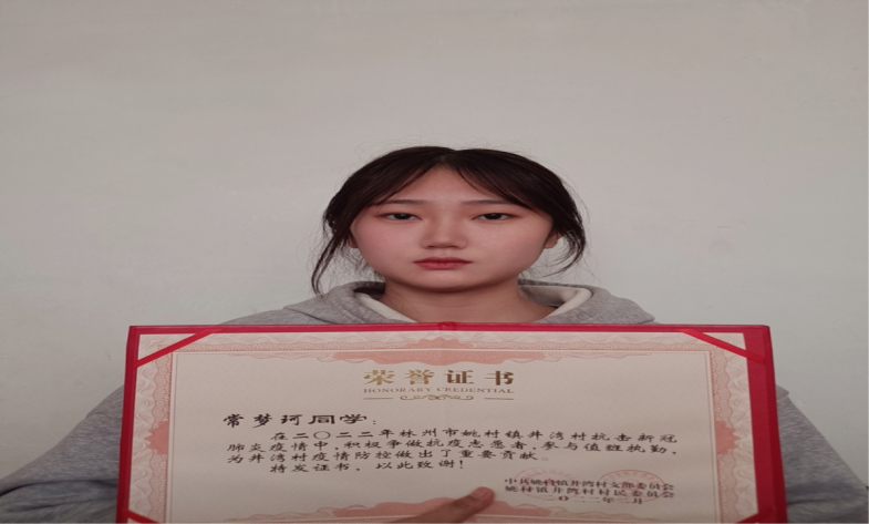 2022年1月16日——2月5日,在安阳市林州市姚村镇井湾积极争做抗疫志愿者,参与值班执勤,由村民委员会为其颁发荣誉证书。