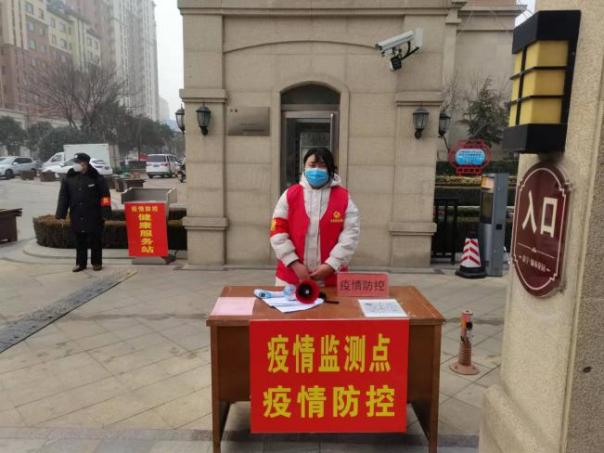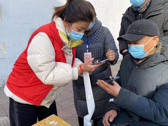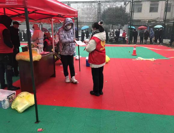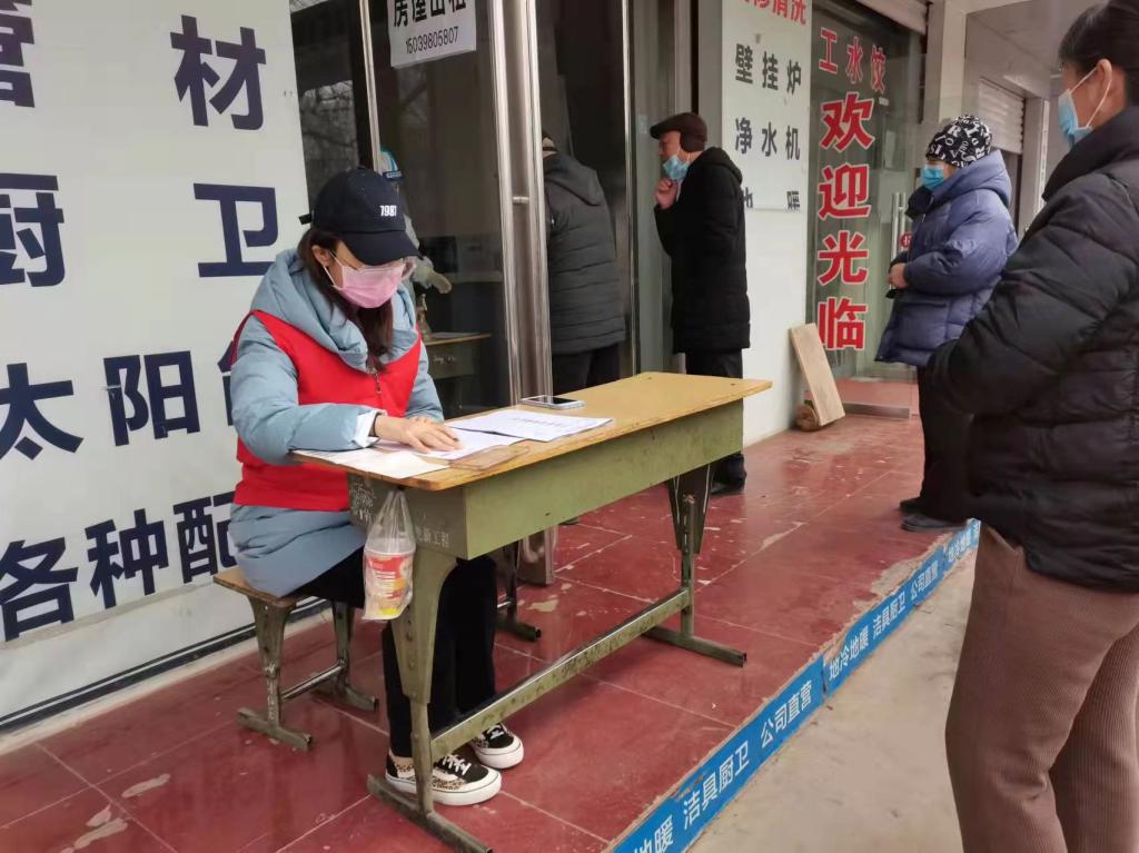 2022年1月10日在鹤壁市淇滨区九州路大赉店社区,负责维持社区居民排队测核酸的秩序,并且对测完核酸的居民发放该社区的通行证。