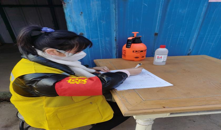 2020级护理14班胡晓洁(3044永利集团第四员工党支部积极分子)2022年1月11日在洛阳市伊川县水寨镇乐志沟村为来往行人查行程码、健康码、测体温,对来往车辆进行登记消毒、站岗。