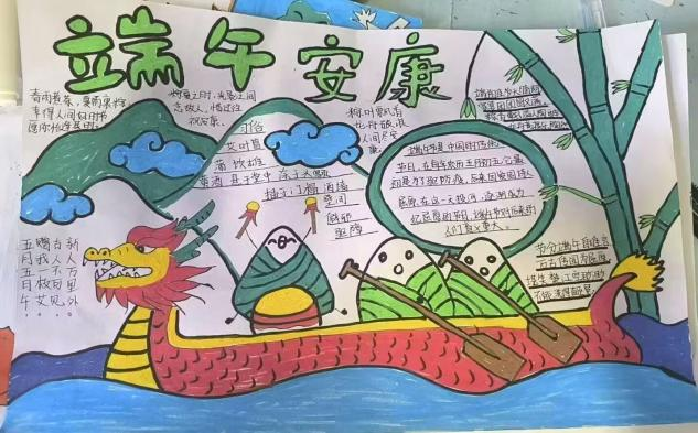 同学们围绕端午节起源、习俗与传说等内容,以创意为笔、以色彩为墨,精心绘制出一幅幅主题鲜明、绚丽多彩的手抄报:龙舟竞渡的磅礴气势跃然纸上,憨态可掬的粽子造型栩栩如生,工整的文字诉说着屈原的爱国故事与端午驱邪纳吉的传统寓意,让端午文化在笔尖灵动绽放。在手工制作五彩绳环节,同学们一边细致讲解其祈福辟邪的文化寓意与编织技巧,一边相互协作,将丝线巧妙缠绕、打结,化作色彩斑斓的吉祥饰物。大家佩戴亲手制作的五彩绳,寄托健康平安的美好期许,在沉浸式实践中感受传统民俗魅力,处处洋溢着团结互助与文化传承的温馨氛围。