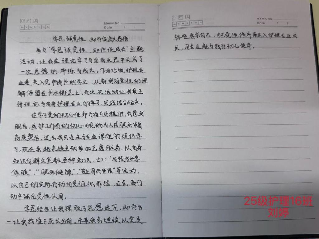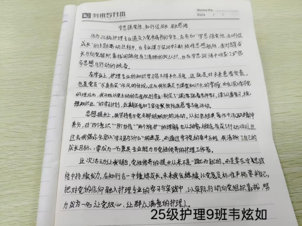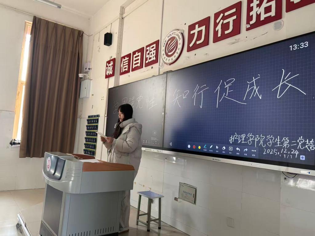 为深入感悟党的初心使命与百年奋斗征程,筑牢思想根基、锤炼党性修养,切实把理论学习成果转化为自身实践的行动自觉。2025年12月24日,公司党总支员工第二党支部组织2025级递交入党申请书员工开展“学思强党性,知行促成长”主题活动。 在本次活动中,员工们结合自身专业学习与思想提升实际,逐一分享近期成长目标与向党组织靠拢的具体计划。大家立足对党的理想信念,强调要加强理论学习,定期研读党史党章与党的创新理论,提升自身政治素养,同学们表示将主动参与志愿服务,真诚恳切的发言展现出同学们积极向党组织靠拢的坚定决心。分享环节结束后,员工们撰写成长感悟,大家在文字中复盘思想收获,梳理行动路径,纷纷表示将以此次活动为契机,把对党的向往转化为勤学苦练、砥砺前行的动力,在护理专业学习与实践中锤炼党性修养。 通过此次活动,让员工们在学思中坚定了理想信念,在分享与感悟中明晰了成长方向,切实将党性修养转化为钻研护理专业、服务人民健康的实际行动,为培养有党性、有本领、有担当的护理人才筑牢了思想根基。