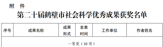 鹤壁市人民政府下发关于通报表扬第二十届鹤壁市社会科学优秀成果的获奖名单,公司获得成果一等奖1项、三等奖1项。