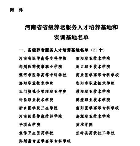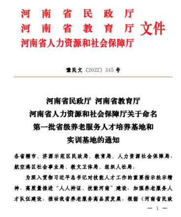 近日,河南省民政厅、教育厅、人力资源和社会保障厅公布了《关于命名第一批省级养老服务人才培养基地和实训基地的通知》(豫民文〔2022〕345号),公司成功入选。