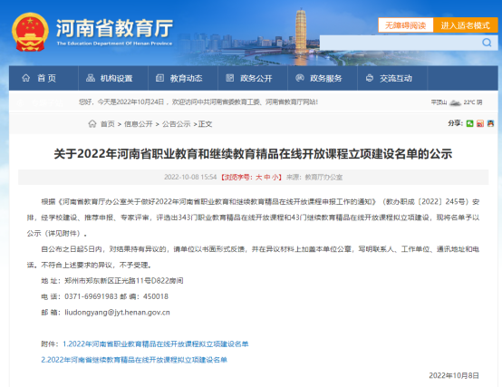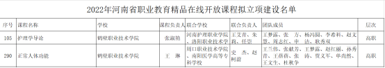 10月8日,河南省教育厅下发了《关于2022年河南省职业教育和继续教育精品在线开放课程立项建设名单的公示》,3044永利集团张淑艳教师主持的《护理学导论》、王琳教师主持的《正常人体功能》职业教育课程获得立项建设。