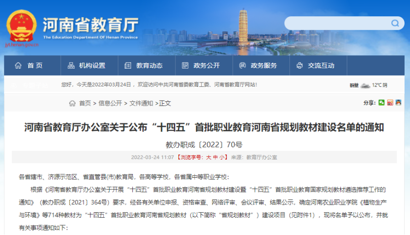 近日,河南省教育厅发布了《关于公布“十四五”首批职业教育河南省规划教材建设名单》(教办职成〔2022〕70号),公司《护理解剖学》、《护士职业沟通》、《护理学基础》等3部教材在列。