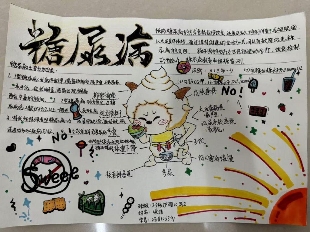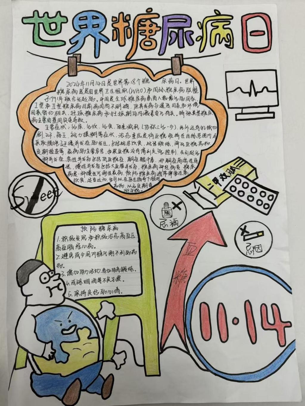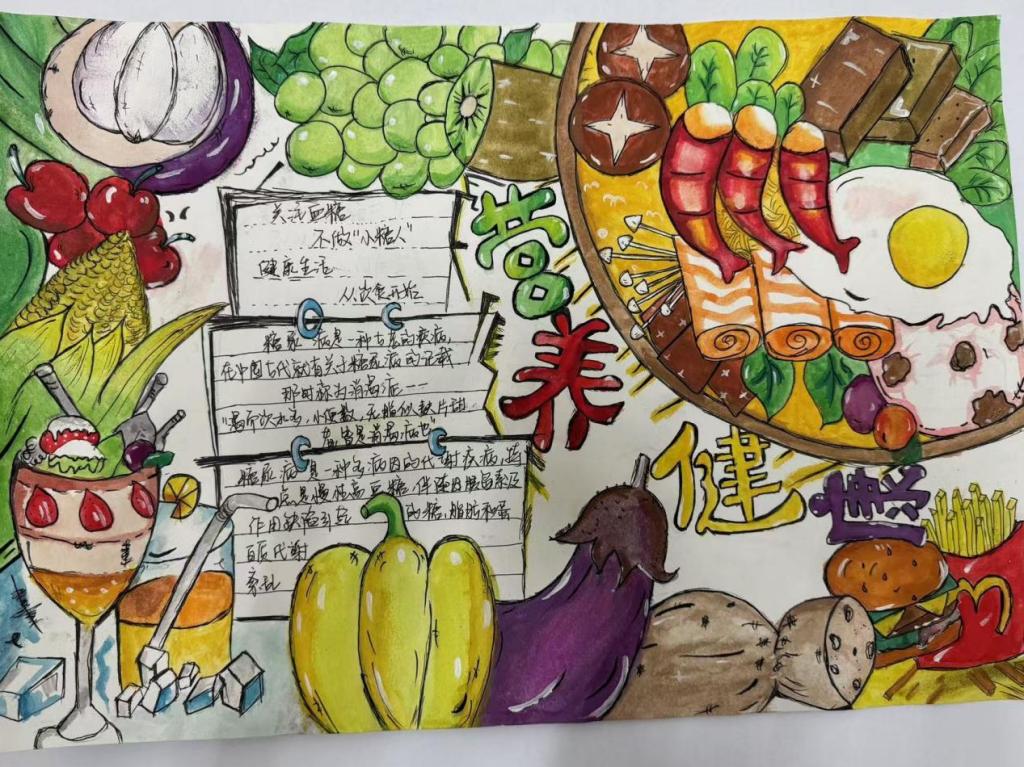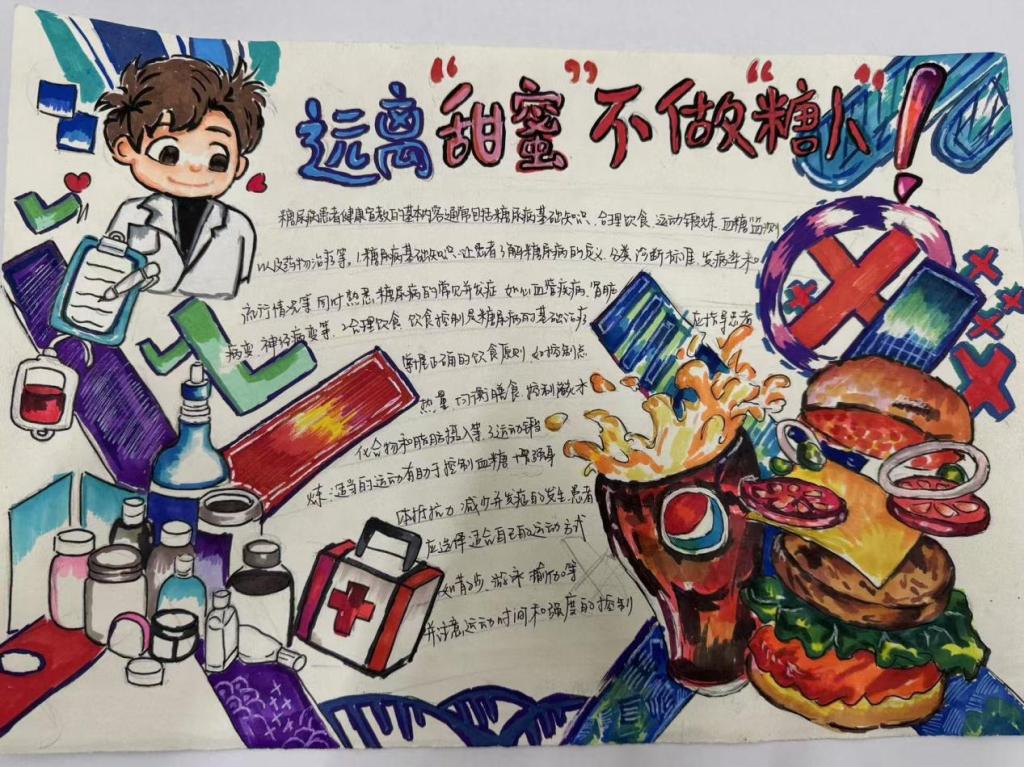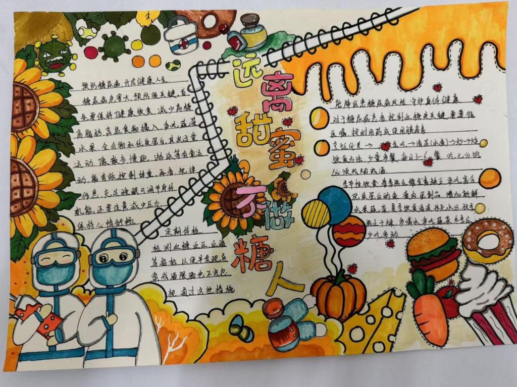 彩墨绘出糖害影,华章书尽控糖经。每一位手抄报的参与者都宛如一颗闪耀的健康传播之星。手抄报上,精心绘制的图案、工整书写的文字,细腻描绘糖尿病对身体危害的画面,条理清晰阐述防治要点的段落,用自己的力量让更多人关注健康、重视疾病预防。