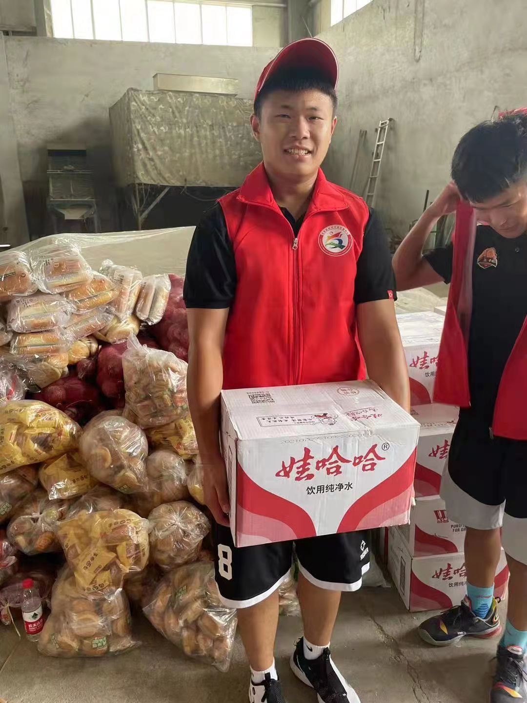 20级护理19班周淇翔,7月24日在河南省鹤壁市浚县七环参加抗洪救灾志愿服务活动,为受灾群众搬运救灾物资。