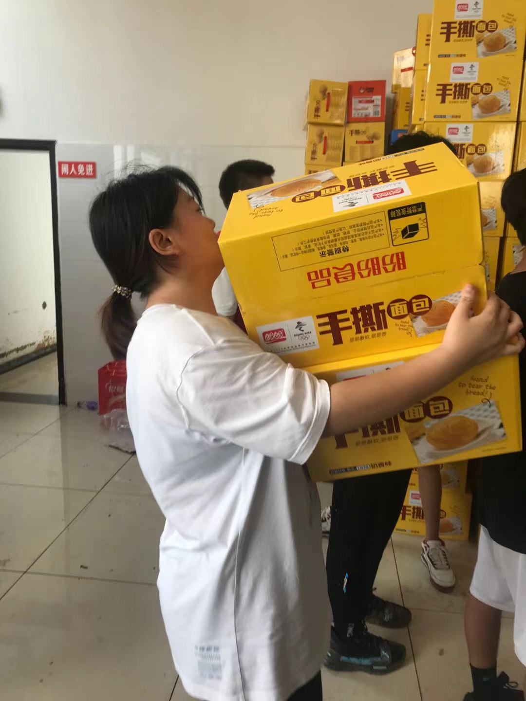 20级护理13班刘嘉乐,在抗洪期间于浚县七环物流中心旁边的浚县救援物资装卸中心当志愿者帮忙装卸物资。