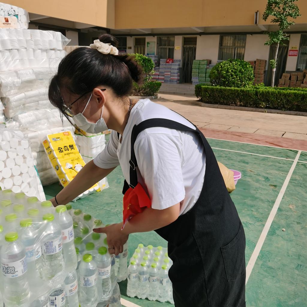 20级护理8班徐欣欣,7月24日起在鹤壁市淇县职业中专、中美物流园等地参与抗洪救灾志愿服务活动,为受灾群众搬运救援物资,打扫卫生清理场地等。