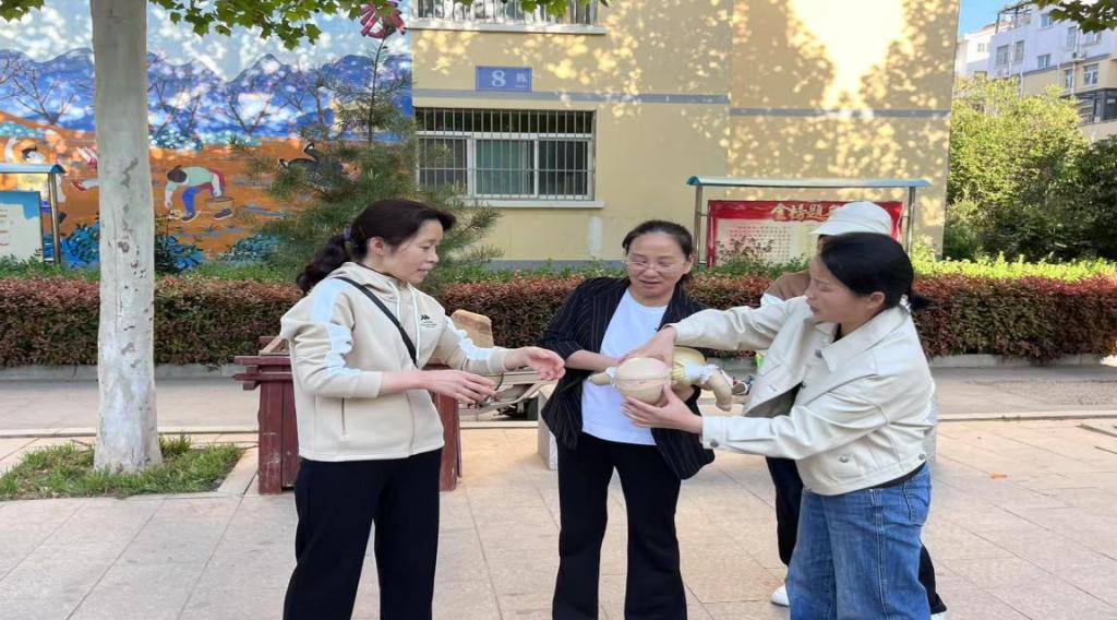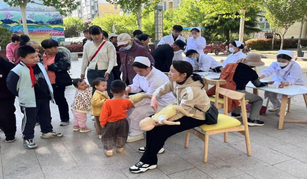 在社区工作人员的帮助下,利用社区小广场为居民开展服务活动,同学们引导老人有序 进行血压测量,并认真记录每位测量者的血压数据,在测量血压的过程中,志愿者们还积极向居民们普及健康知识,讲解高血压的危害以及预防和控制高血压的方法。面对带孩子的家长, 师生以生动有趣的方式向家长与孩子们介绍海姆立克急救法。在活动现场,两名同学一组模拟演示成人海姆立克急救法的操作步骤,还利用婴儿教具,模拟异物卡喉场景,详细讲解并演示婴儿海姆立克急救法的操作流程。家长们热情高涨,积极参与互动,在轻松愉快的氛围中学会了这一重要的急救技能。