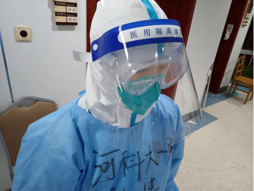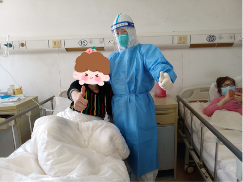 短暂调整后,于5月4日8:00到达新的战场——上海中医药大学附属曙光医院重症病区。并与当日和曙光医院的老师们成功抢救百岁老人,看到老人转危为安,悬着的心也放下了。她是第一个带着自制防护头套为患者吸痰的。各项护理操作:静脉输液:抽动脉血气、胃肠减压、俯卧位通气、高流量吸氧等等,是每天的护理日常。清晰记得5月10日05:27,一位乳腺癌术后的阿姨突然心率下降、呼吸停止、意识不清,在所有人的通力配合下,患者生命体征趋于平稳;5月13日18:15,一位87岁高龄的患者,突发室颤,在没有除颤仪的情况下,通过大家的努力,在除颤仪拿到床旁时,患者心律已转为窦性心律……5月24日8:00结束了在定点医院的最后一个班。通过同事们齐心协力的努力,实现了医务人员零感染,患者零死亡的目标,圆满的完成了为期52天的援沪工作!